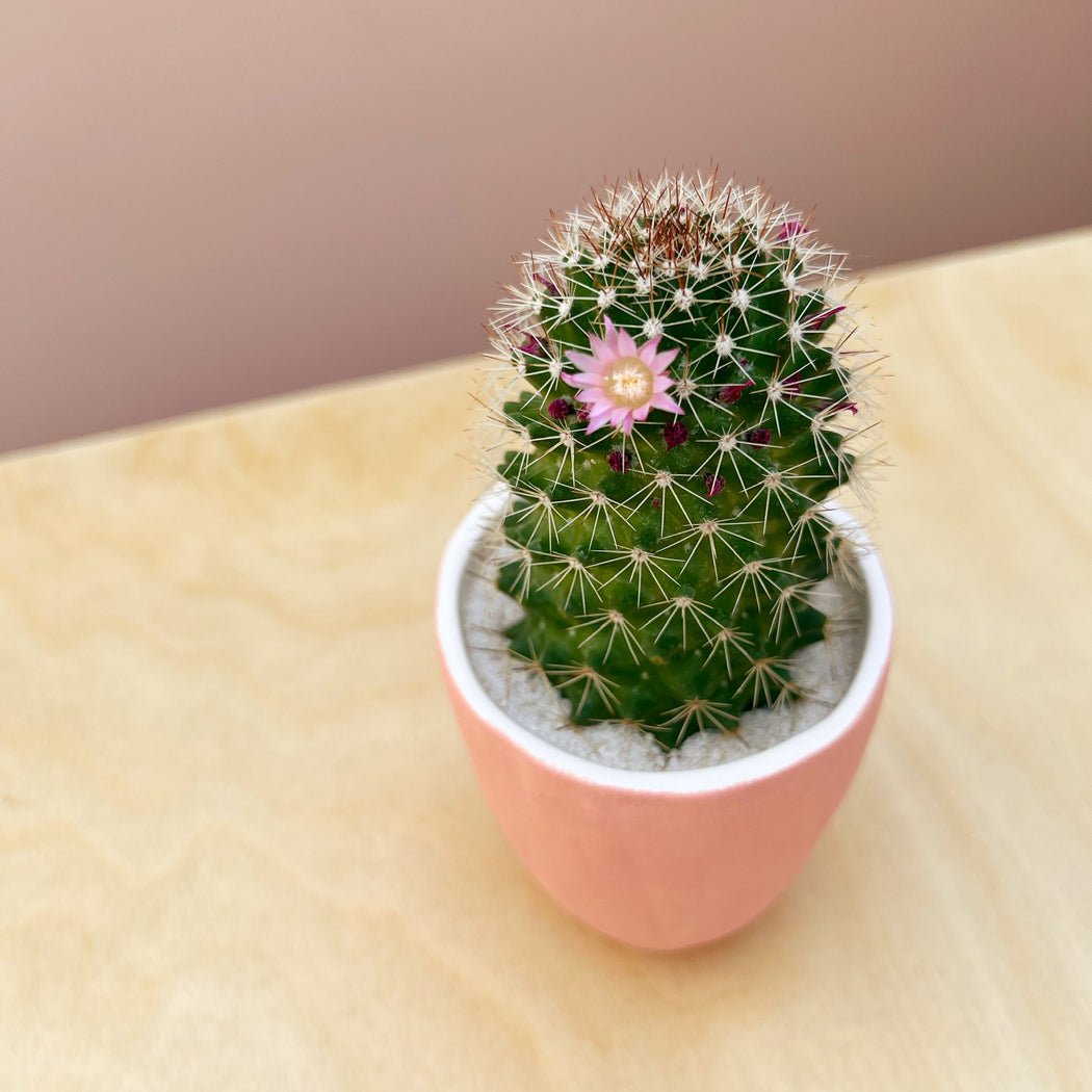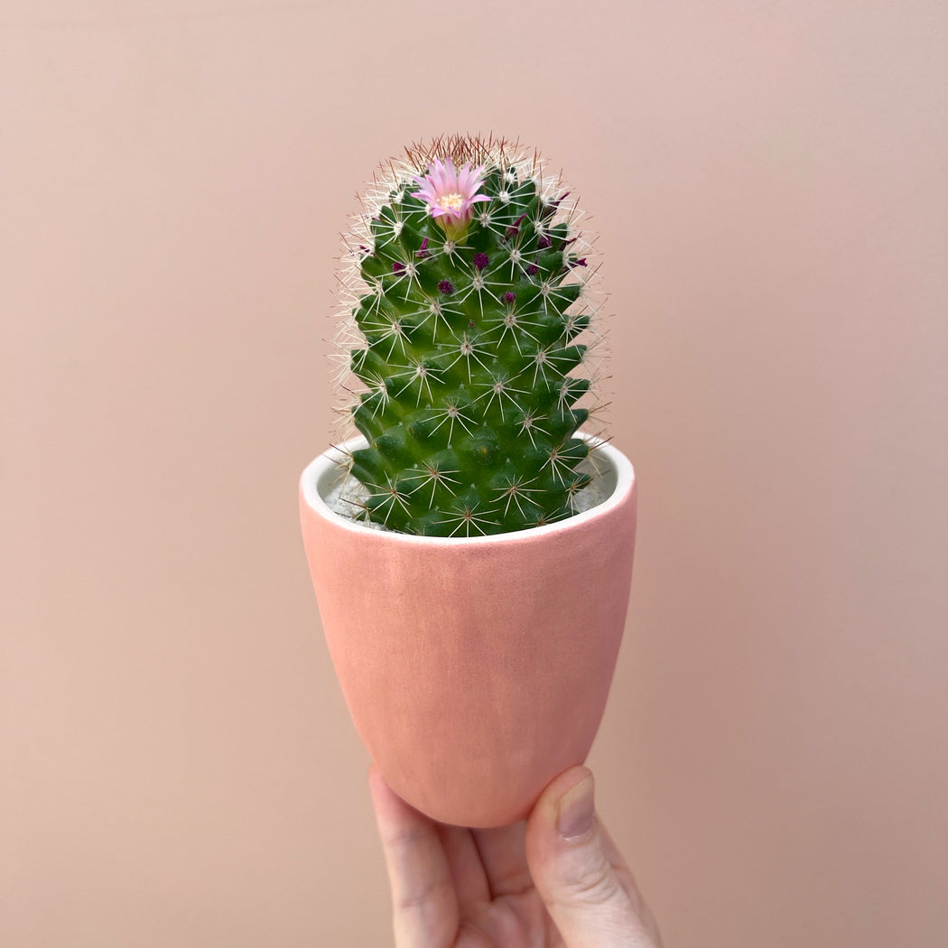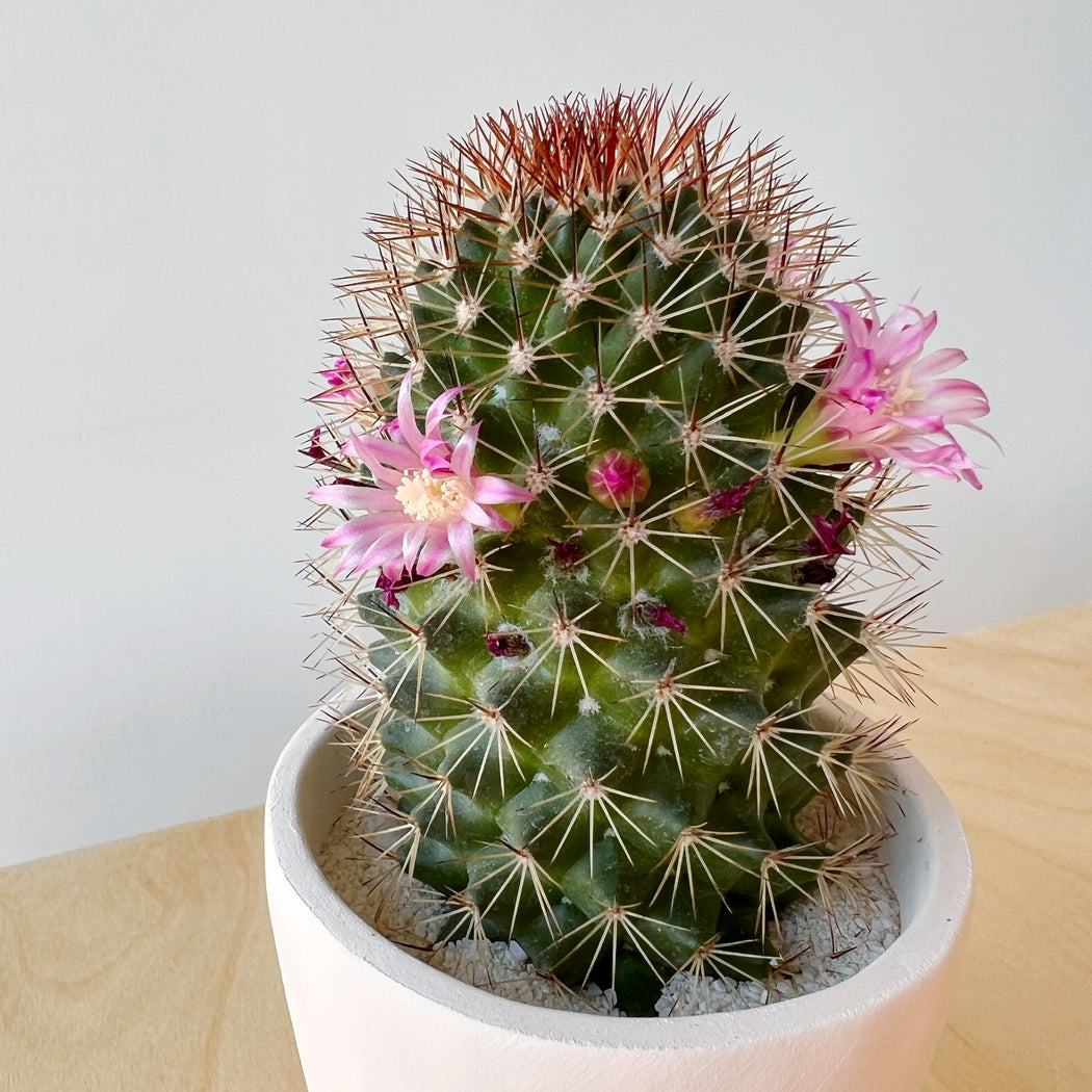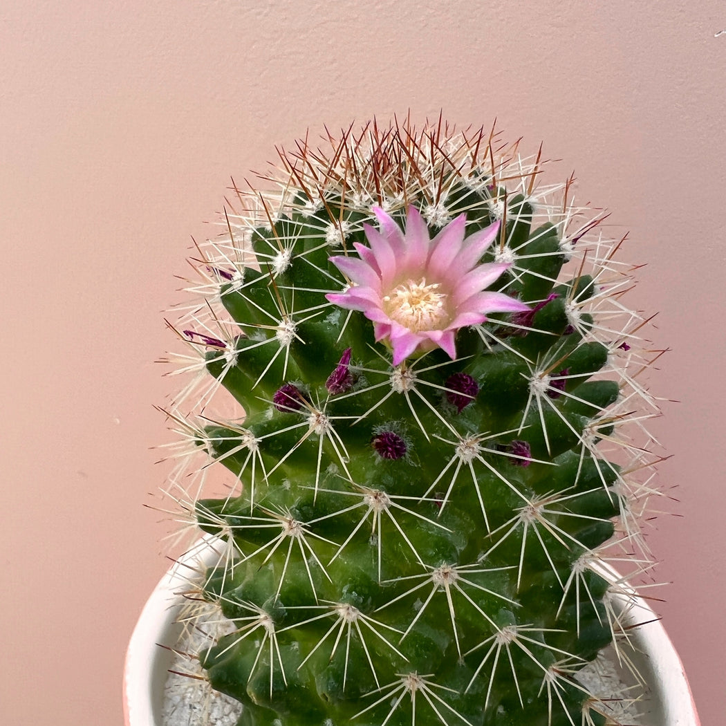 Phillip is a frequently blooming cactus and tends to flower with a crown of pink blooms!