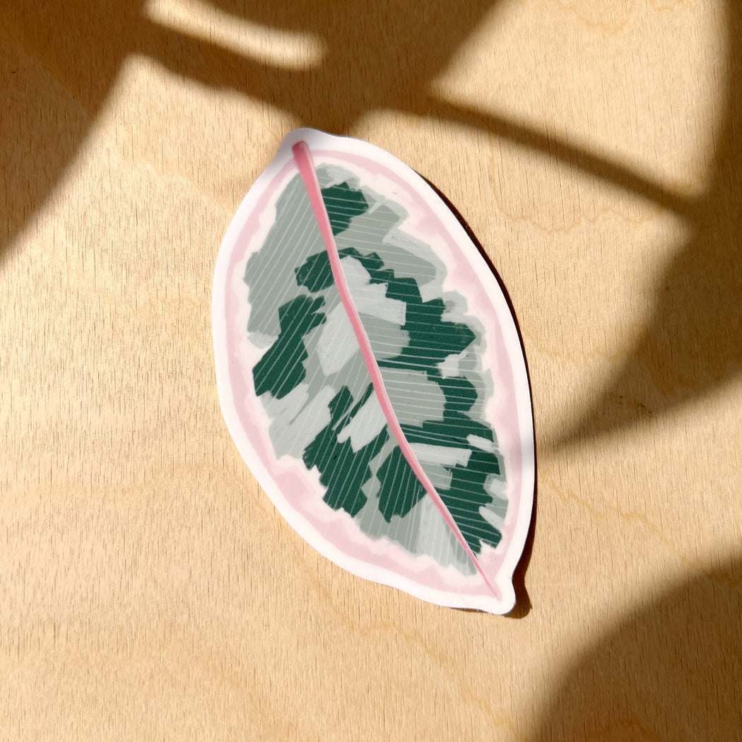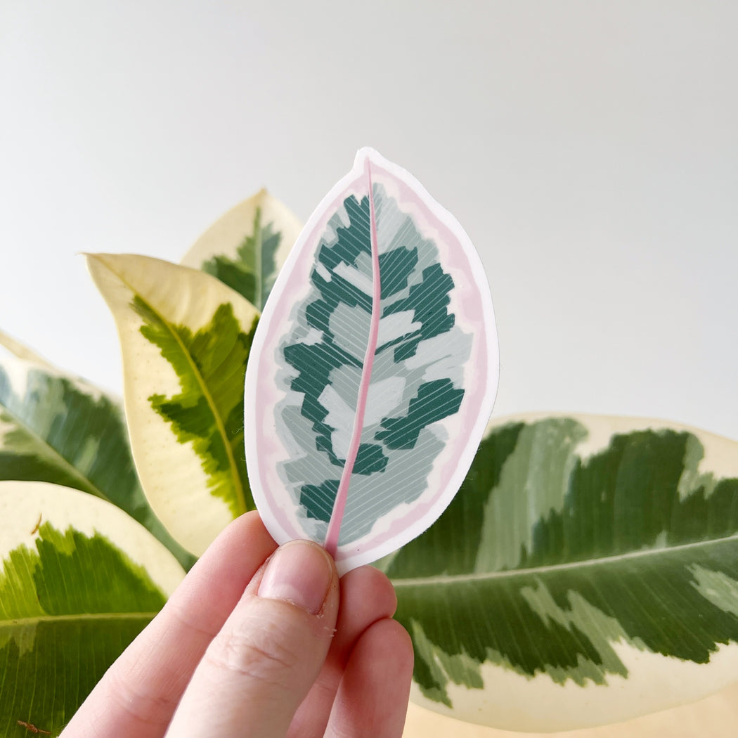 When our variegated rubber plant aka ficus elastica variegata ruby gets Spring and Summer sun, its leaves are a soft pink hue that Seana captured here in her hand illustrated sticker.