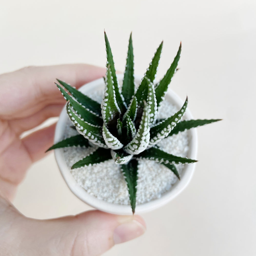 This Small Beto Zebra Succulent + Handmade Planter cactus stays this size and is extremely easy to care for! It’s hard to believe but even after having your plant baby for years you won’t have to put it in a bigger pot!